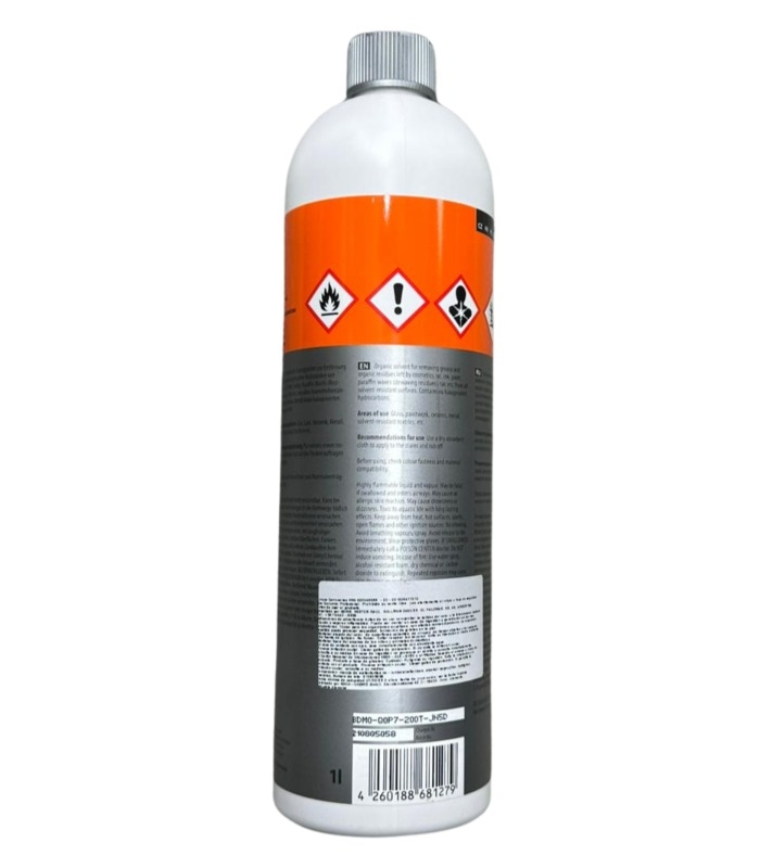 El producto especial para la rápida eliminación de adhesivos (p. ej. residuos de pegatina), goma, resina, neblina de pintura, manchas de tinta, aceites, grasas, alquitrán, etc. de fondos resistentes al disolvente como lacas, cristal, cerámica, metal, etc. Evapora rápidamente sin dejar residuos y no contiene hidrocarburos halogenados.