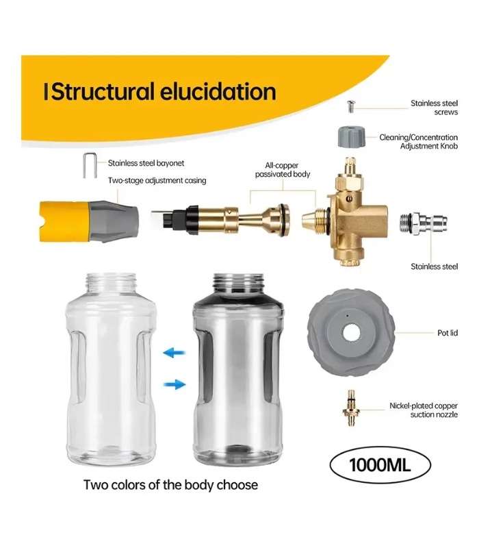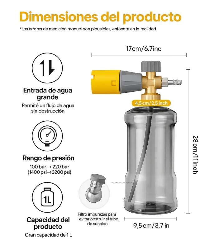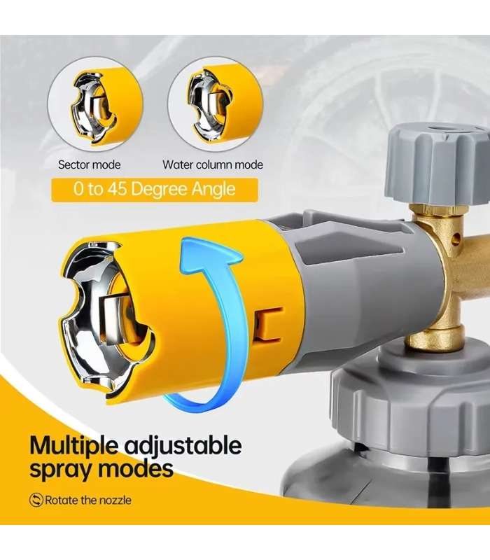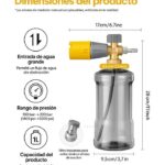 MÁXIMA GENERACIÓN DE ESPUMA El cañón de espuma Storm Pro crea enormes cantidades de espuma de lavado de autos, lo que facilita un lavado seguro y sin rayones. FÁCIL AJUSTE Cuenta con una perilla de espuma de fácil ajuste que le permite controlar la densidad de la espuma para satisfacer sus necesidades específicas y los niveles de suciedad del vehículo. BISEL DE GRAN SOPLADO Esta característica da forma al aire y la espuma que salen de la boquilla, dirigiéndolos hacia una corriente ultra ancha de espuma espesa y esponjosa para una cobertura máxima. TECNOLOGÍA DE FLUJO COMPLETO Permite un amplio abanico o un chorro de espuma concentrado, lo que lo hace perfecto para vehículos de todos los tamaños y formas, así como para otras superficies grandes.