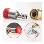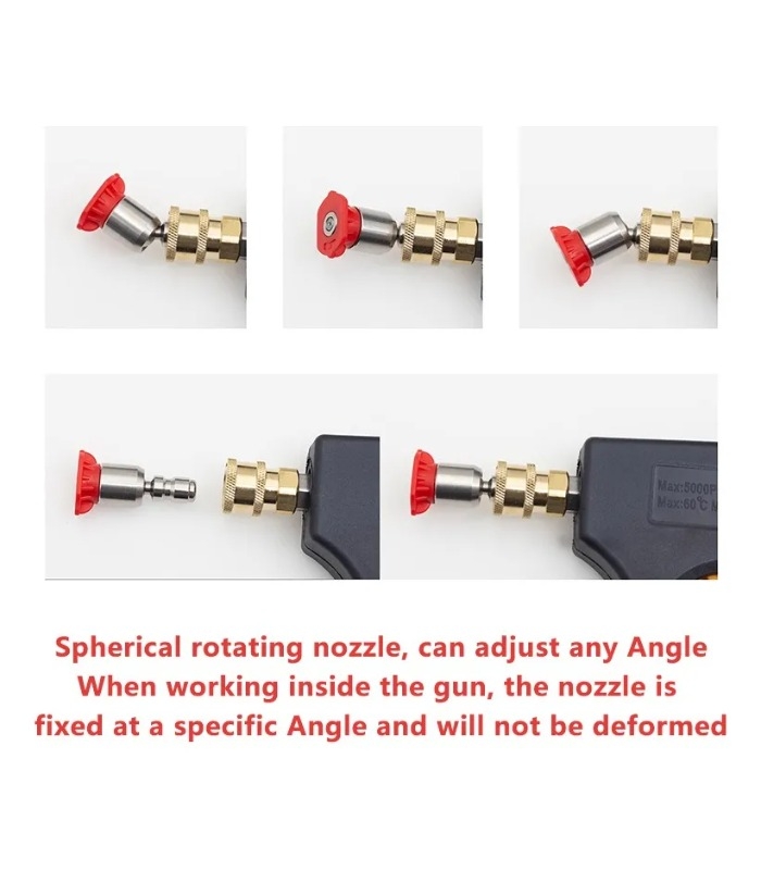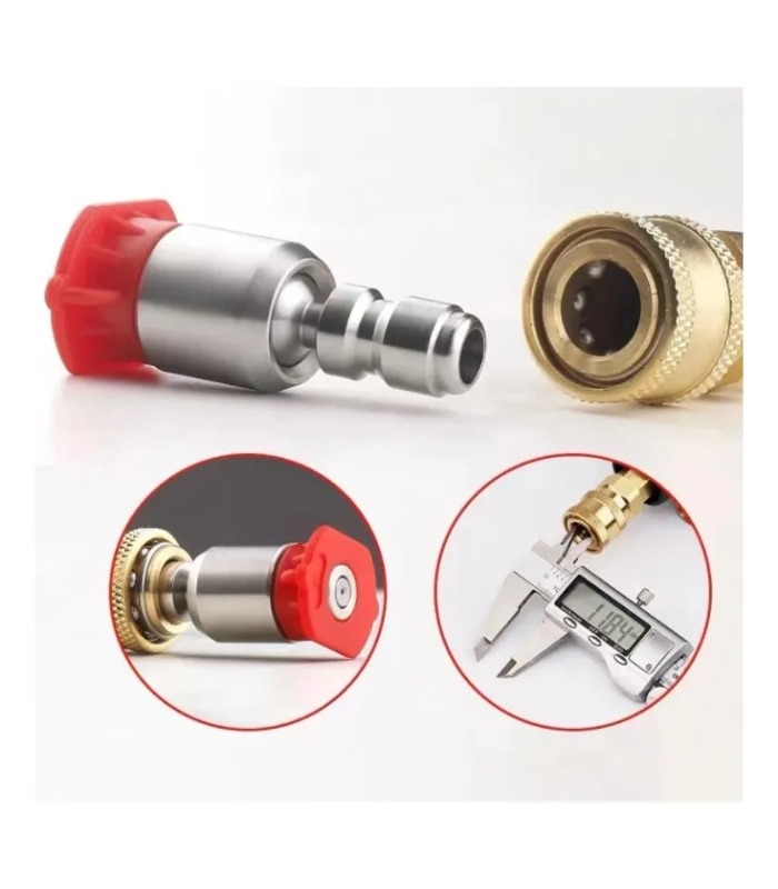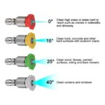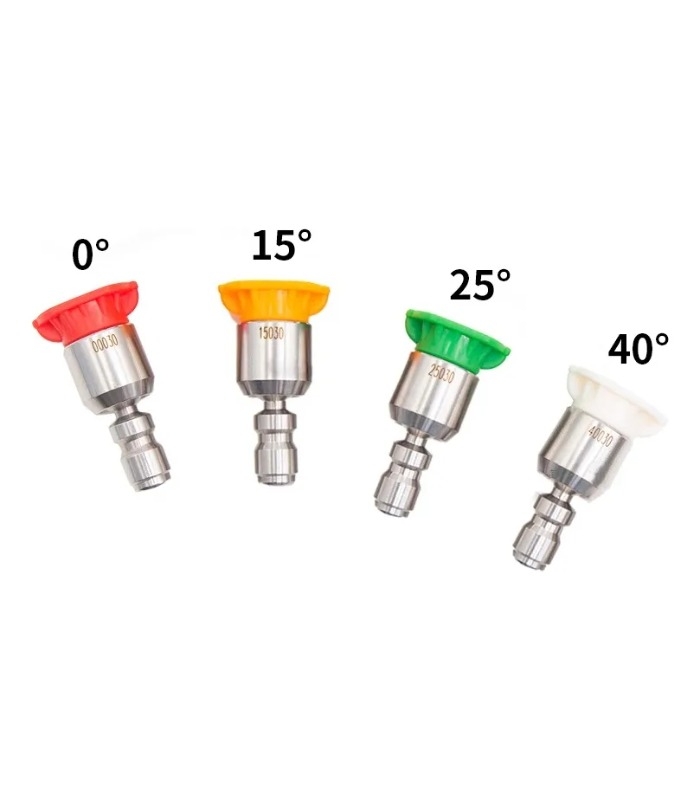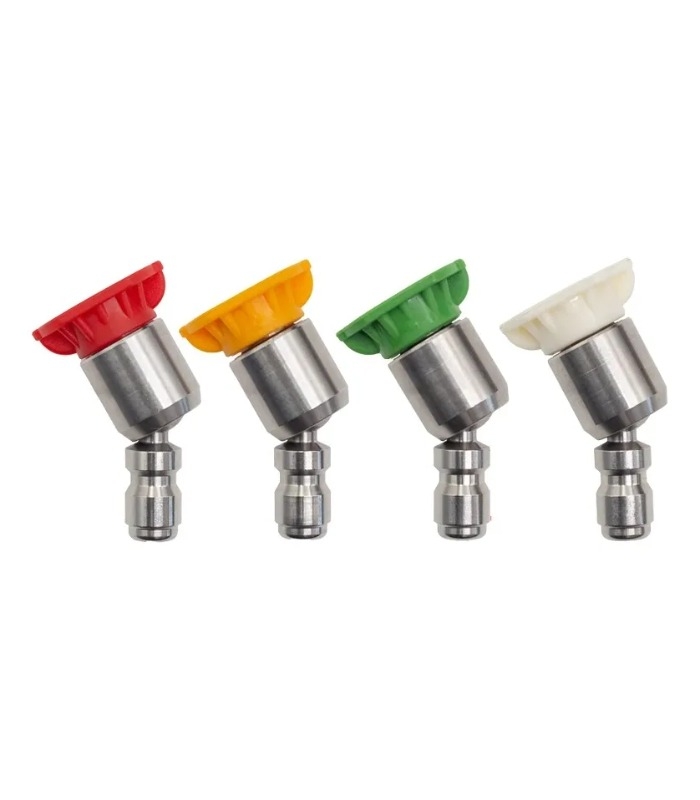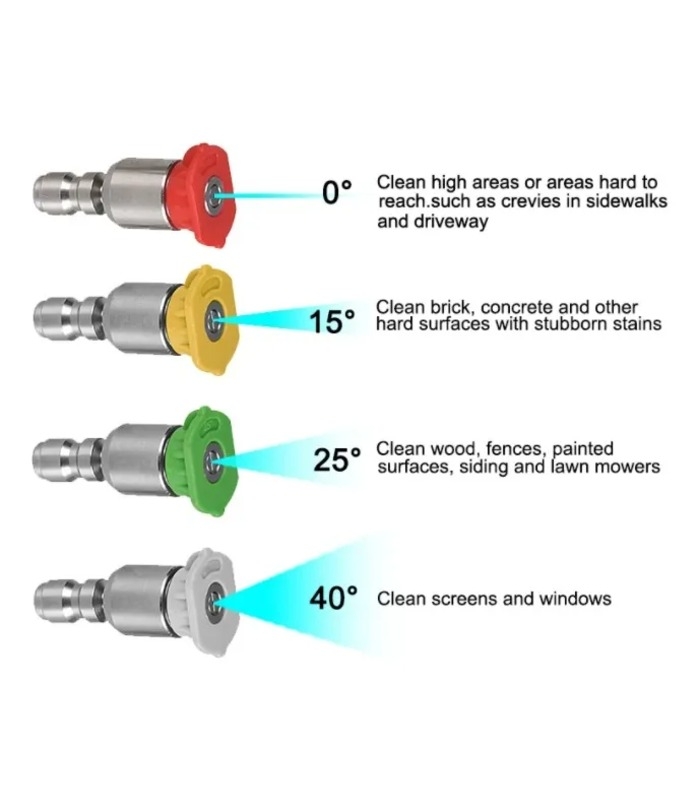 Para lanzas de hasta 200 bar Compuesto por los siguientes 4 picos: Pico de Corte: pico Cincel: 15º Amarillo. Usado a 15º actúa como una espátula. Remoción de pintura, grasa, moho y manchas. Pico Lavado: 25º Verde. Pico genérico para aplicaciones de lavado en general. Lavado de garajes, veredas, muebles de jardín, etc. Pico Spray: 40º Blanco. Pico de Ancho Spray para lavar o enjuagar grandes superficies. Lavado de vehículos, ventanas. Pico para Jabón: “Jabón” Negro Pico de baja presión para .uso de jabón/detergente. Aplicación de espuma y enjuague de la misma.