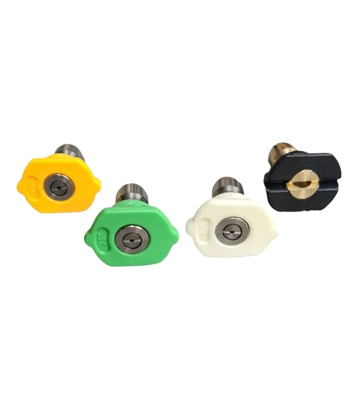 Para lanzas de hasta 200 bar Compuesto por los siguientes 5 picos: Pico de Corte: pico Cincel: 15º Amarillo. Usado a 15º actúa como una espátula. Remoción de pintura, grasa, moho y manchas. Pico Lavado: 25º Verde. Pico genérico para aplicaciones de lavado en general. Lavado de garajes, veredas, muebles de jardín, etc. Pico Spray: 40º Blanco. Pico de Ancho Spray para lavar o enjuagar grandes superficies. Lavado de vehículos, ventanas. Pico para Jabón: “Jabón” Negro Pico de baja presión para .uso de jabón/detergente. Aplicación de espuma y enjuague de la misma.