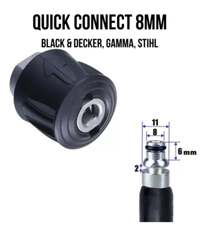 Este acople rapido solo es compatible si las medidas coinciden exactamente con las del equipo del comprador. Si alguna de las medidas es diferente, NO VA A SERVIR. Verifique cuidadosamente el tipo de rosca y el diametro antes de comprar. El acople rapido Quick Connect M22 permite conectar y desconectar facilmente la manguera de la hidrolavadora o la pistola sin necesidad de herramientas. Fabricado en materiales resistentes, asegura un ajuste firme y una excelente estanqueidad. Beneficios principales Facilita el cambio rapido entre pistolas, mangueras y accesorios Conexion y desconexion rapida tipo Quick Connect Evita perdidas de presion o fugas de agua Compatible solo con modelos que utilicen rosca M22 y las medidas indicadas Material de alta resistencia para uso intensivo Caracteristicas tecnicas Tipo de rosca M22 macho y hembra segun configuracion del modelo Fabricado en laton y acero de alta durabilidad Diseñado para hidrolavadoras Gamma, Bosch, Black and Decker, Stihl y otras que usen M22 Conexion tipo Quick Connect con acople rapido de presion No compatible con sistemas de rosca diferentes o medidas distintas Compatibilidad Este acople sirve solo si las medidas coinciden exactamente con el equipo. Si la rosca, el diametro o el sistema de acople es diferente, no se podra instalar ni utilizar. Antes de comprar, compare visualmente el tipo de conexion y mida el diametro interno y externo. Usos recomendados Conexion rapida entre manguera y pistola de hidrolavadora Adaptacion de accesorios o extensiones en sistemas M22 Ideal para uso profesional, talleres, lavaderos y tareas de detailing