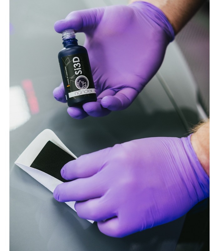 Basado en la sofisticada tecnología orgánica de polisilazano, Nanolex Si3D forma una matriz tridimensional reticulada para brindar una excelente hidrofibicidad y una mayor dureza junto con una durabilidad excepcional y una superficie mucho más fácil de limpiar. Nanolex Si3D agregará una capa transparente de varias micras de espesor con un efecto de oscurecimiento del color a la superficie tratada. El espesor del recubrimiento, combinado con la densidad de la matriz Nanolex Si3D, hace que el recubrimiento sea altamente resistente a la abrasión y al ataque químico causado por el lavado frecuente. Todos los polímeros de alto rendimiento de Si3D no contienen disolventes aromáticos ni flúor. Para lograr los resultados deseados sólo se requiere una capa de Si3D. Nanolex Si3D fue desarrollado, probado y fabricado en Alemania.