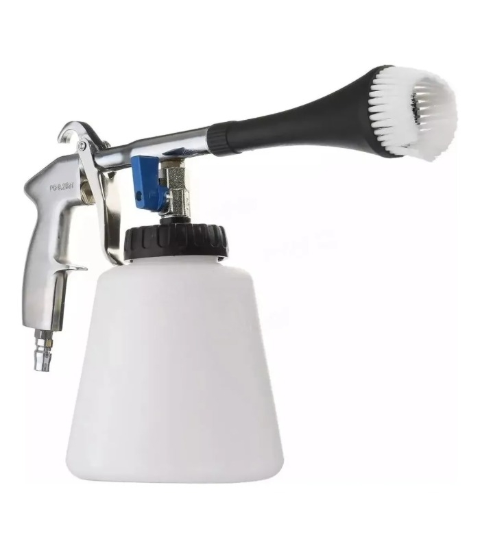 Se trata de una de las herramientas mas utilizadas y eficientes para limpiar todas las superficies del interior del vehículo. La pistola de limpieza Tornador trabaja con un compresor de aire que le da la potencia para que el limpiador contenido en el recipiente de la pistola (desengrasante / shampoo) alcance las grietas en las cuales no se pueden alcanzar con la mano. Limpia alfombras, plásticos, y tapicería del interior del vehículo.